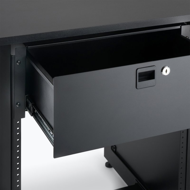 Provides a rack with storage for accessories such as cables, connectors, and tools