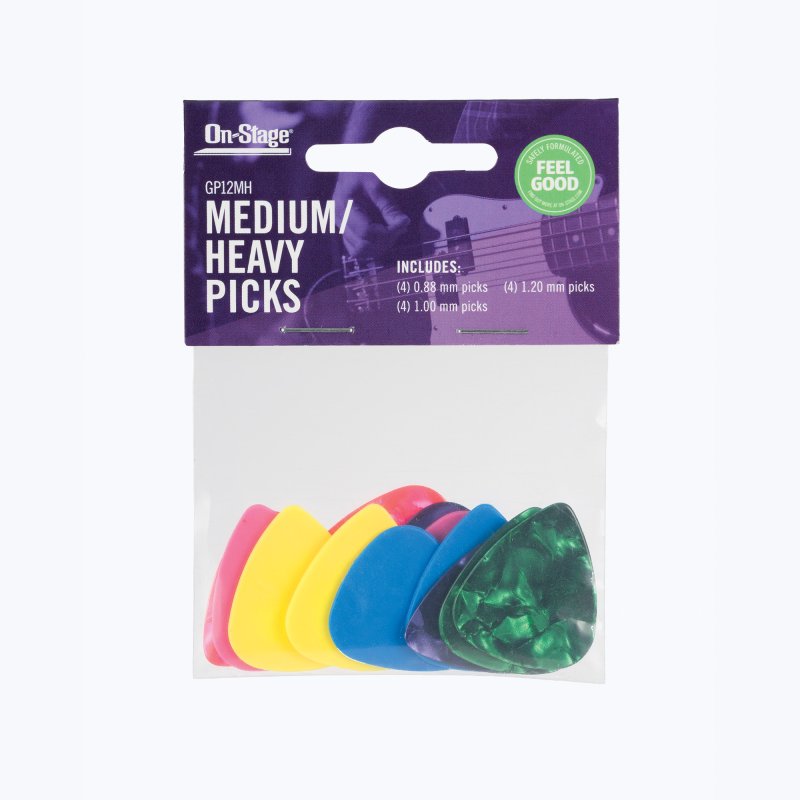The GP12MH Medium / Heavy Guitar Picks provide guitar and bass players with a multitude of string-plucking options. With 12 picks to choose from, including four each of 0.88 mm, 0.96 mm, and 1.2 mm gauges, guitarists and bassists are presented with a varied palette of volume, tone, and articulation. This pack of picks gives players access to nylon picks with a fast attack and brighter tone as well as celluloid picks with more of a relaxed feel, which produce a mellower tone. The various gauges allow you to further tailor your tone, with the medium range being semi-flexible for a straightforward string sound, and the heavy range not bending at all, resulting in a more aggressive chugging thud. Every pick in this assortment has a smooth string strike that lets players control dynamics, and a comfortable gripping surface. And once players become acquainted with the characteristics of each pick, the shell-like celluloids and opaque nylons in assorted colors make it easy to visually identify the one they want to use. Equally at home with electric, acoustic, and bass guitars, these picks deliver long-lasting service regardless of playing style. |