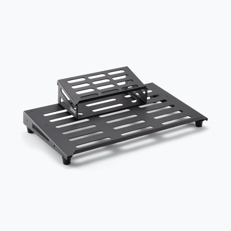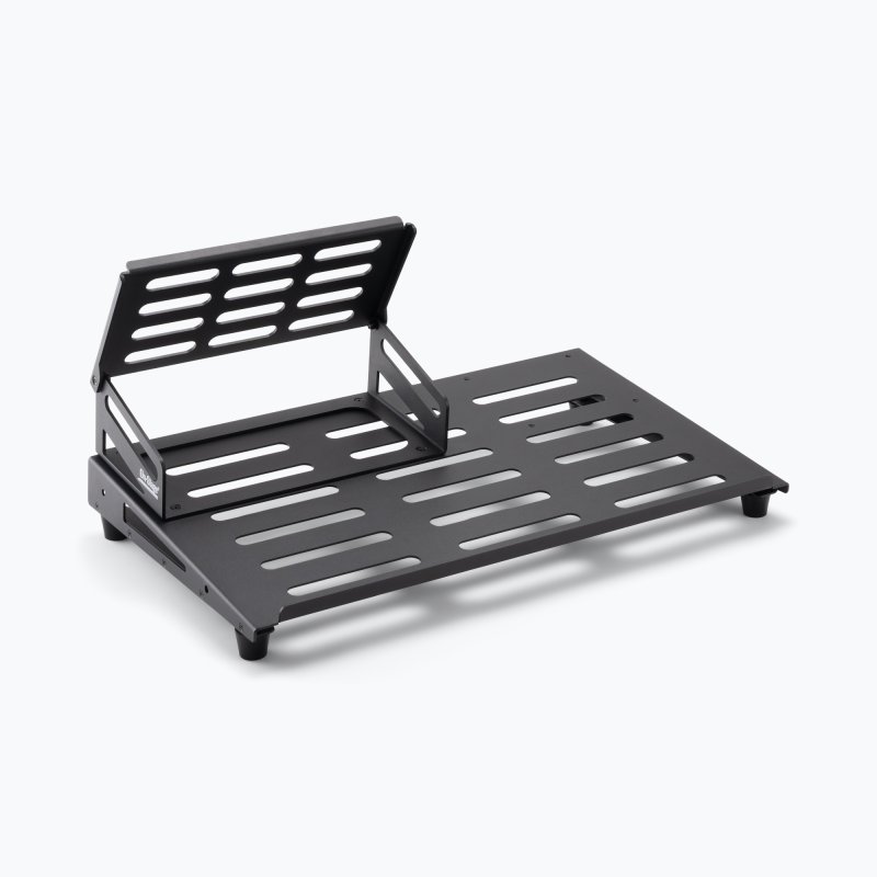 The GPB-DLX Deluxe Pedalboard provides a secure foundation for pedals and enables users to easily store and transport an entire effect chain as a single portable unit. The main platform and upper tier are angled toward the user for comfortable viewing and ease of operating the foot switches. While pedals vary in size, this two-tiered board has plenty of room for up to 11 standard-sized (1590B enclosure) pedals. The upper tier, which holds three standard-sized pedals, can be removed entirely, or positioned on the left, on the right, or in the center of the main platform to fit the user’s preferred pedal arrangement. An added benefit of the upper tier is that a power supply, buffer, or other utility device can be mounted below it without taking up precious pedal space. With the upper tier oriented left or right, the main platform accommodates volume and wah pedals. Slot cutouts make it easy to neatly and efficiently route patch cables and power cords below the surface and out of the way for an organized setup. Constructed of steel, this pedalboard delivers reliable support for your equipment and resists flexing. Nonslip rubber feet prevent slides and skids to keep the setup safely in place. Adhesive hook-and-loop strips are included to prepare the platform and pedals for proper mounting. Quickly attaching pedals using magnets (sold elsewhere) is also possible. For ease of storage and transportation, a protective padded gig bag is included that features a zipper closure, a top handle, and a removable adjustable shoulder strap. |