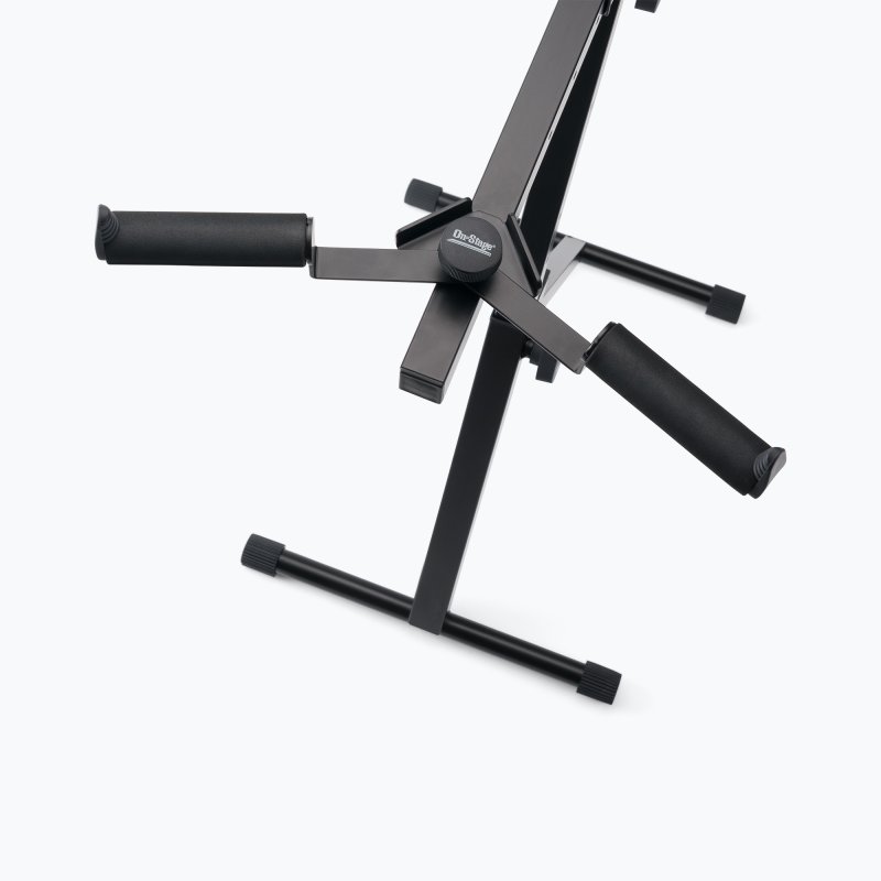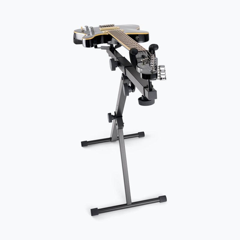 The GSWB5000 Guitar Stand Workbench safely supports an instrument while making it easier for the user to perform tasks ranging from basic maintenance to intricate repairs and modifications. Compact and portable, this versatile tool conserves floor space and can be set up in a studio, backstage, in a shop, or anywhere work needs to be done on an instrument. The guitar-holder assembly provides four tilt options, allowing the user to choose the best angle for working on setups, pickup swaps, potentiometer and switch replacements, nut filing, or hardware upgrades. And this feature can be used to perfectly orient the guitar horizontally for playing slide. Plus, when it’s not being used as a workbench, this versatile accessory can be configured for use as a traditional guitar stand, providing a reliably safe place to rest a guitar out of its case between playing sessions. The height of the stand can also be set to optimize viewing and comfort while work is carried out. The distance between the body and headstock yokes adjusts to fit a wide range of instruments including electric, acoustic, and bass guitars. The body yoke can be swiveled and widened or narrowed to match the width and shape of the instrument’s body style. Bumpers and nonslip padding protect the guitar finish from scratches and increase instrument stability. To ensure proper weight distribution and balance, the guitar-holder assembly can slide so that the heaviest part of the guitar is positioned over the base. All of these adjustments are quickly and easily achieved through the use of twist-and-pull knobs that require minimal turning and securely lock settings in place. Heavy-duty metal construction and a wide base footprint deliver stability and safety for instruments. And rotating leveling feet make it possible to compensate for uneven flooring. |