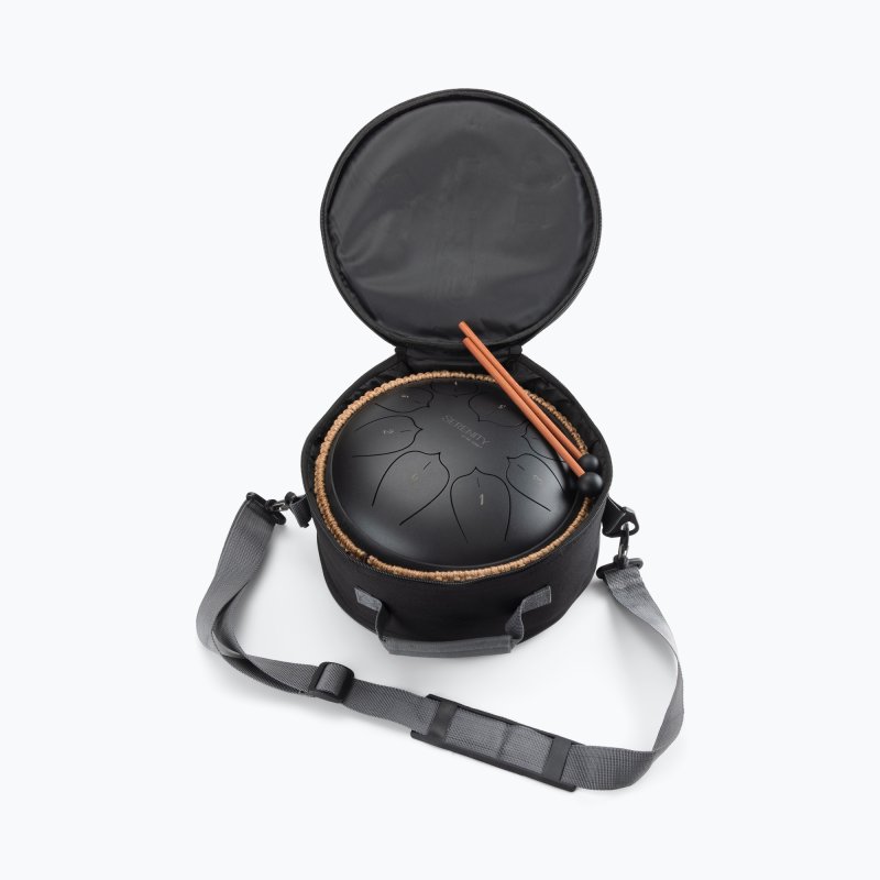 The SD5010 Serenity Series Steel Tongue Drum is a multifaceted percussion instrument used to produce not only long, slow, ethereal tones perfect for meditation, yoga, sound healing, and relaxation, but also rhythms and melodies suitable for many kinds of music. Uniquely pure, clear, and resonant bell-like sounds are easily achieved—even for users with no prior experience playing music. The eight keys of this drum each represent a precision-tuned note in the C-major pentatonic scale. As the keys never go out of tune, it’s easy to maintain, and the available notes are pleasing in any combination. The keys come pre-labeled and adhesive key labels are also included to facilitate teaching and learning. While the drum can be played using just the fingertips, two striking accessories are included: rubber-tipped finger sleeves that help players achieve a soft, calming, droning timbre, and rubber-tipped mallets that impart more definition and volume. Crafted from carbon steel with a powder-coat finish, this instrument delivers strength and durability for long-lasting performance. An outer wrap made of woven cord increases traction to provide a stable hold during performance, practice, and lessons. In addition to a rubber rest that keeps mallets organized and in place, the drum also comes with a carry bag that features a zipper closure, an adjustable shoulder strap, and a top handle for ease of storage and transportation. |
