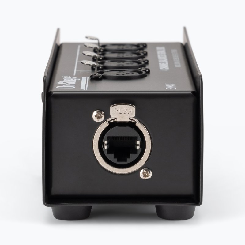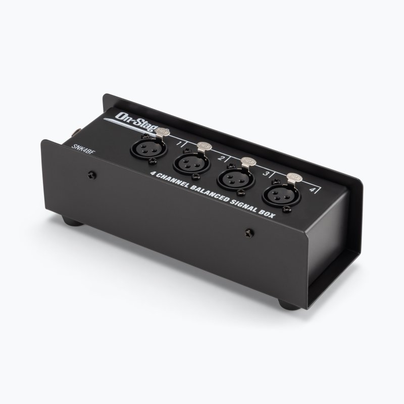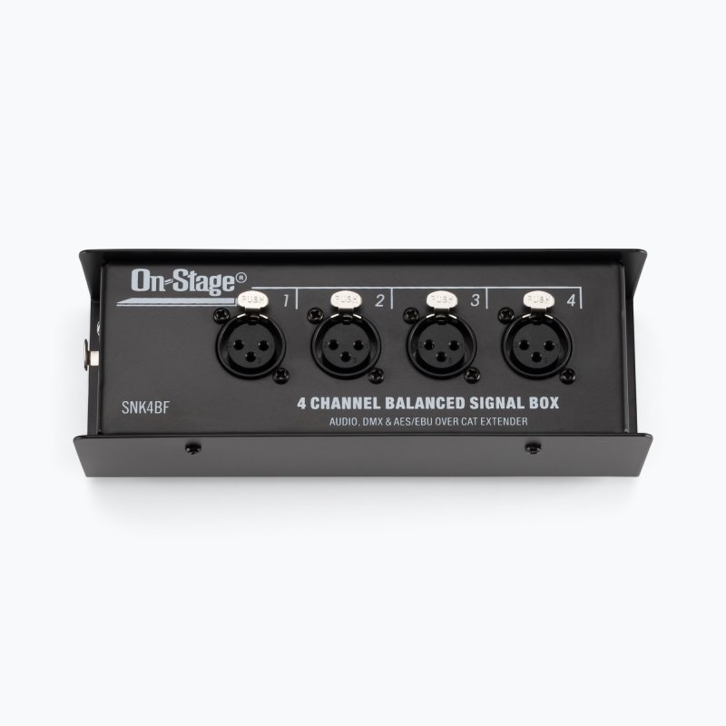 The On-Stage Production-Grade SNK4BF Snake Box consolidates four XLR connections into a single ethernet cable. Supported signals include balanced-analog audio for microphones, instruments, and speakers as well as digital protocols such as DMX and AES/EBU for stage lighting and audio. This bidirectional device routes signals in either direction to suit a wide range of setups. The RJ45 connector accepts a shielded CAT 5, 5E, 6, 6A, or 7 cable, making it easy to protect signal integrity. It even passes phantom power for mics. With its passive circuit, flat frequency response, low THD, and low noise floor, this Snake Box provides clear, high-quality audio transmission. It’s simple to use, requires no power source, and its compact size makes it easy to transport to and from gigs. And the rugged metal enclosure delivers protection for the internal components to ensure long-lasting, dependable performance. |