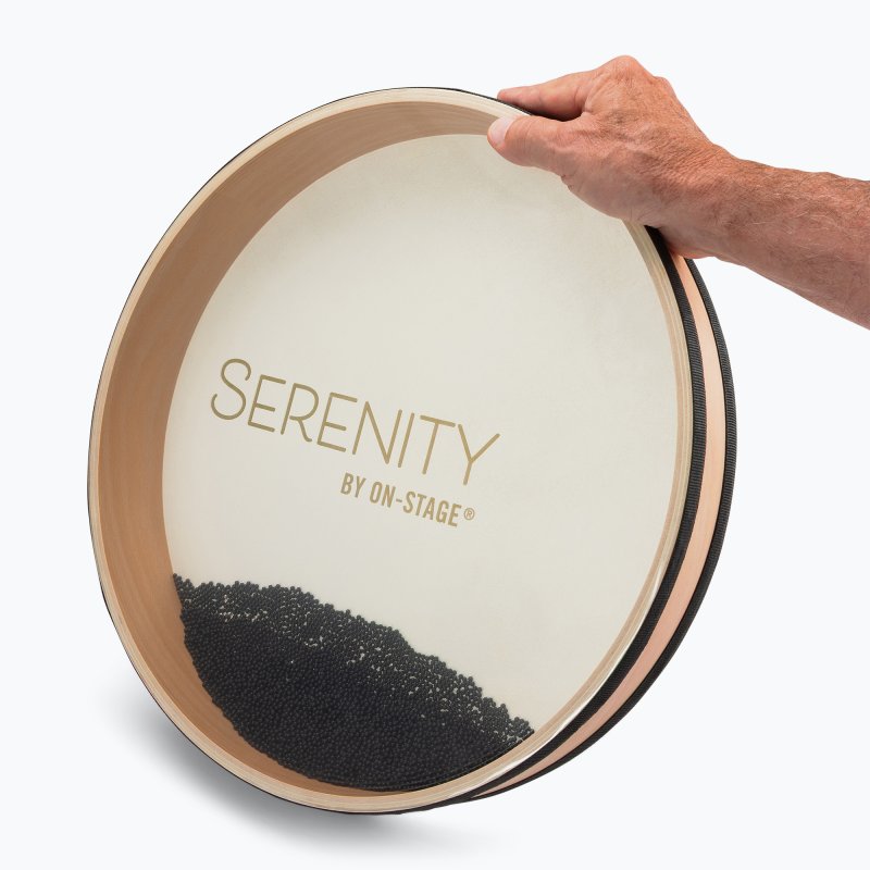 The WBD5016 Serenity Series Wave Bead Drum is a versatile percussion instrument that can be used as an oceanic sound effect or as a powerful stand-in for a drum kit or several pieces of handheld percussion. Much depends on how it’s held, how fast it’s moved, which side is facing up, which beads are inside, and whether it’s struck or shaken. Starting with its ability to mimic nature, this drum can sound like the tranquil ebb and flow of waves lapping the shore—perfect for meditation and sound therapy—or surf crashing against the rocks, or even like a steady rainfall. To achieve these sounds, the drum is held horizontally. Gradually tilting it results in a gentler effect and tipping it quickly intensifies the experience. Users can further control the sound by letting the internal plastic and metal beads roll against either the PET head for a brighter timbre or the goatskin head for a mellower tone. Moreover, the plug on the frame makes it possible to remove some of the beads, with a higher ratio of plastic to metal resulting in a smoother wave sound. As for its percussive abilities, this single drum can sound like many being played at the same time. Holding the drum vertically and striking the heads in the center produces a resonant note reminiscent of a bass drum or tom-tom. Striking the heads near the bottom edge gives it a snare-like sizzle. Bouncing the frame or shaking it puts it squarely in shaker or cabasa territory. Using all these techniques to create a rhythm pattern feels at once familiar and unique and will surely lead to new musical ideas to explore. The combination of the beechwood frame with synthetic and goatskin heads delivers strength to ensure long-lasting performance, even under heavy use.